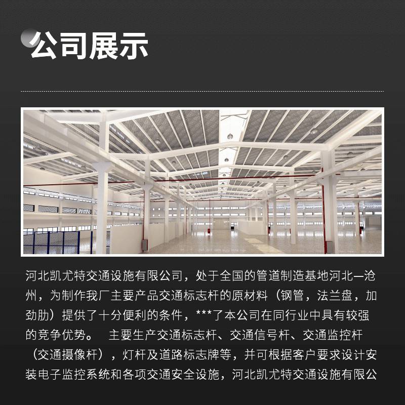 河北凯尤特交通设施有限公司,处于全国的管道制造基地河北—沧州,为制作我厂主要产品交通标志杆的原材料(钢管,法兰盘,加劲肋)提供了十分便利的条件,***了本公司在同行业中具有较强的竞争优势。 主要生产交通标志杆、交通信号杆、交通监控杆(交通摄像杆),各种型号灯杆及道路标志牌等,并可根据客户要求设计安装电子监控系统和各项交通安全设施,河北凯尤特交通设施有限公司凭借沧州地区管道制造基地优势成为华北地区的标志杆生产厂家。 本公司近年来与多家大型实力雄厚的交通设施企业建立了长期合作关系,凭借产品质量过硬,按工期准时交货,***了高速公路按时通车,获得客户的一致认可和好评。 本公司奉行“诚实做人,诚信做事”的宗旨,通过严格的内部管理和科学的营销机制,始终从用户实际需求出发,以用户满意为核心价值,立足客户需求,精益求精,全方位打造“顾客驱动、持续改进、追求***”的质量文化体系,产品赢得了广大用户的信赖和厚爱,销售网络遍及全国二十多个省、市、自治区。 在日益激烈的市场竞争中,公司将继续加大科技投入,严格企业管理,力争以优质的产品质量、合理的销售价格、完善的售后服务、 蓬勃向上的团队精神,去争取更广阔的市场。 本公司设备***,技术力量雄厚,诚信可靠,服务周到,经营灵活。热烈欢迎各界同仁和广大用户来我企业洽谈业务,携手合作,共同发展。 "时间锤炼企业的成长,信念铸造企业方向",我们会在新老客户的支持下携手并进共创双赢,共同***广告事业的辉煌明天。在日益激烈的市场竞争中,公司将继续加大科技投入,严格企业管理,力争以优质的产品质量、合理的销售价格、完善的售后服务、 蓬勃向上的团队精神,去争取更广阔的市场。
