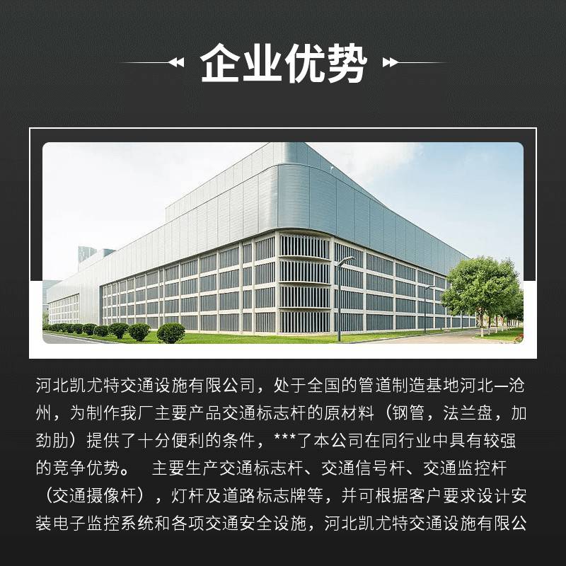 河北凯尤特交通设施有限公司,处于全国的管道制造基地河北—沧州,为制作我厂主要产品交通标志杆的原材料(钢管,法兰盘,加劲肋)提供了十分便利的条件,***了本公司在同行业中具有较强的竞争优势。 主要生产交通标志杆、交通信号杆、交通监控杆(交通摄像杆),各种型号灯杆及道路标志牌等,并可根据客户要求设计安装电子监控系统和各项交通安全设施,河北凯尤特交通设施有限公司凭借沧州地区管道制造基地优势成为华北地区的标志杆生产厂家。 本公司近年来与多家大型实力雄厚的交通设施企业建立了长期合作关系,凭借产品质量过硬,按工期准时交货,***了高速公路按时通车,获得客户的一致认可和好评。 本公司奉行“诚实做人,诚信做事”的宗旨,通过严格的内部管理和科学的营销机制,始终从用户实际需求出发,以用户满意为核心价值,立足客户需求,精益求精,全方位打造“顾客驱动、持续改进、追求***”的质量文化体系,产品赢得了广大用户的信赖和厚爱,销售网络遍及全国二十多个省、市、自治区。 在日益激烈的市场竞争中,公司将继续加大科技投入,严格企业管理,力争以优质的产品质量、合理的销售价格、完善的售后服务、 蓬勃向上的团队精神,去争取更广阔的市场。 本公司设备***,技术力量雄厚,诚信可靠,服务周到,经营灵活。热烈欢迎各界同仁和广大用户来我企业洽谈业务,携手合作,共同发展。 "时间锤炼企业的成长,信念铸造企业方向",我们会在新老客户的支持下携手并进共创双赢,共同***广告事业的辉煌明天。在日益激烈的市场竞争中,公司将继续加大科技投入,严格企业管理,力争以优质的产品质量、合理的销售价格、完善的售后服务、 蓬勃向上的团队精神,去争取更广阔的市场。
