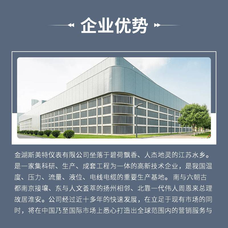 金湖斯美特仪表有限公司坐落于碧荷飘香、人杰地灵的江苏水乡。是一家集科研、生产、成套工程为一体的高新技术企业,是我国温度、压力、流量、液位、电线电缆的重要生产基地。 南与六朝古都南京接壤、东与人文荟萃的扬州相邻、北靠一代伟人周恩来总理故居淮安。公司经过近十多年的快速发展,在立足于现有市场的同时,将在中国乃至国际市场上悉心打造出全球范围内的营销服务与网络销售体系。 斯美特建立的网上业务平台可以给您提供***的技术与优质的服务。团队文化建设是公司的发展命脉之源,“创造***、成就梦想、锲而不舍、自强不息”是美斯特人的团队精神与文化的核心。公司在人才引进、技术培训、团队打造方面投入了大量的精力,从而在汇集了一批敬业乐群技术专家的同时,还拥有一批勇于进取、业务熟练、吃苦耐劳的员工队伍。此外,我公司技术力量雄厚,生产设备***,检测手段齐全,并且制定了系列严谨科学的生产工艺,健全的质保体系,汇聚了众多***的科技人员。 业绩的取得来源于客户的厚爱。本厂全体员工深悟此理,决心用诚实勤奋的态度叙述“用人品铸产品、以质量谋生存、依科技育新品、靠信誉 求发展”的企业宗旨。 期盼在与各界友人的协作中吸收营养,得到启迪,共同探索出一条中国仪器仪表的生存、发展之路!热诚欢迎各界朋友前来参观、考察、洽谈业务!!!