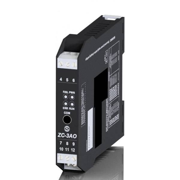 ZC-3AO 用于从 CANopen 系统获取 N.3 模拟输出(mA 或 V)。标准可以是 mA (0..20mA / 4..20mA) 或 V (-10..10 V、0..10 V 或 2..10 V)。电源 // 输入 // RS485 电路之间的 3 路电流隔离可确保数据的完整性。
