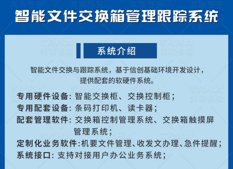 北京天瑞恒安科技有限公司是一家集研发、生产、销售、服务为一体的科技型企业,公司下设两个事业部:公检法司智能文件交换柜事业部、大中院校智能储物柜事业部;天瑞恒安是一家拥有联网型自助寄存柜、智能公文交换柜管理系统软著企业,历经多年行业发展经验,公司秉承新理念,已向市场推广出物联网智能柜系列产品:人脸识别智能储物柜、指静脉手机存放柜、指纹寄存柜、智能装备柜、一卡通联网存包柜、智能物证柜、智能卷宗柜、智能公文交换箱、智能公文流转柜、手机信号屏蔽柜等产品并推向市场,现已形成多个产品类别行销全国。 目前我公司智能箱柜系列产品已服务众多客户,包括微软中国、北京理工大学、山西医科大学、爱康国宾等企事业单位;产品主要应用于:大中院校、市政机关、图书馆、博物馆、公安、司法机关、水上乐园等企事业单位;公司秉承“让寄存更加简单、让生活更加美好”的经营理念,严格依照***国际质量体系的要求,从产品的研发设计、市场销售到售后服务全流程,建立一套严格的品质管理体系! 北京天瑞恒安科技有限公司坚持“以质量求生存、以市场求发展、以客户需求为己任”的经营信念,愿与新老客户携手并进,合作双赢、共创未来!