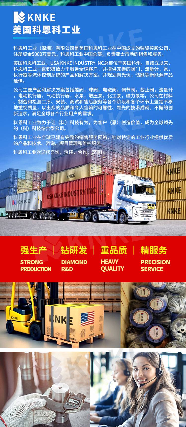 科恩科工业(深圳)有限公司是美国科恩科工业在中国成立的独资控股公司,注册资金5000万美元,科恩科工业中国总部,负责亚太市场的销售和服务。 美国科恩科工业,USA KNKE INDUSTRY INC总部位于美国科州。自成立以来,美国科恩科工业一直积力于服务客户,并提供完善的阀门,流量计,泵,执行器等流体控制系统的产品和解决方案,并规划向光伏,储能等新能源产品延伸。 科恩科公司主要产品和解决方案包括蝶阀,球阀,电磁阀,调节阀,截止阀,流量计,电动执行器,气动执行器,水泵,增压泵,化工泵,磁力泵等。公司在材料、制造和检测工序、安装、调试和售后服务等各个阶段和各个环节上坚定不移地重视质量,以令人信赖的可靠性,满足各个行业用户的需求。 科恩科工业致力于让(科)科技有为,为客户(恩)创造价值,成为一家(科)科技综合型公司。 科恩科工业已建有销售服务网络,针对特定的工业行业提供产品和技术、咨询、项目管理和维护服务。 科恩科工业欢迎您咨询,洽谈,合作,双赢!