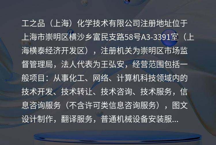 | 经营范围 | 一般项目:从事化工、网络、计算机科技领域内的技术开发、技术转让、技术咨询、技术服务,信息咨询服务(不含许可类信息咨询服务),图文设计制作,翻译服务,普通机械设备安装服务,国内贸易代理,土石方工程施工,工程管理服务,化工产品(不含许可类化工产品)、计算机软硬件及辅助设备、电子产品、仪器仪表、化妆品、包装材料及制品、建筑装饰材料、保温材料、家具、涂料(不含危险化学品)的销售。(除依法须经批准的项目外,凭营业执照依法自主开展经营活动) | ||