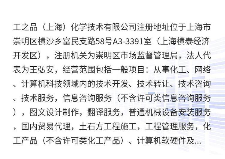 | 经营范围 | 一般项目:从事化工、网络、计算机科技领域内的技术开发、技术转让、技术咨询、技术服务,信息咨询服务(不含许可类信息咨询服务),图文设计制作,翻译服务,普通机械设备安装服务,国内贸易代理,土石方工程施工,工程管理服务,化工产品(不含许可类化工产品)、计算机软硬件及辅助设备、电子产品、仪器仪表、化妆品、包装材料及制品、建筑装饰材料、保温材料、家具、涂料(不含危险化学品)的销售。(除依法须经批准的项目外,凭营业执照依法自主开展经营活动) | ||