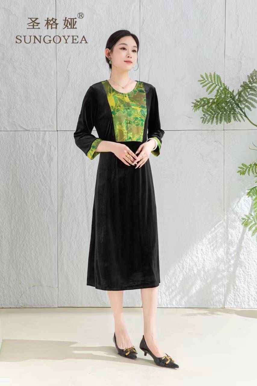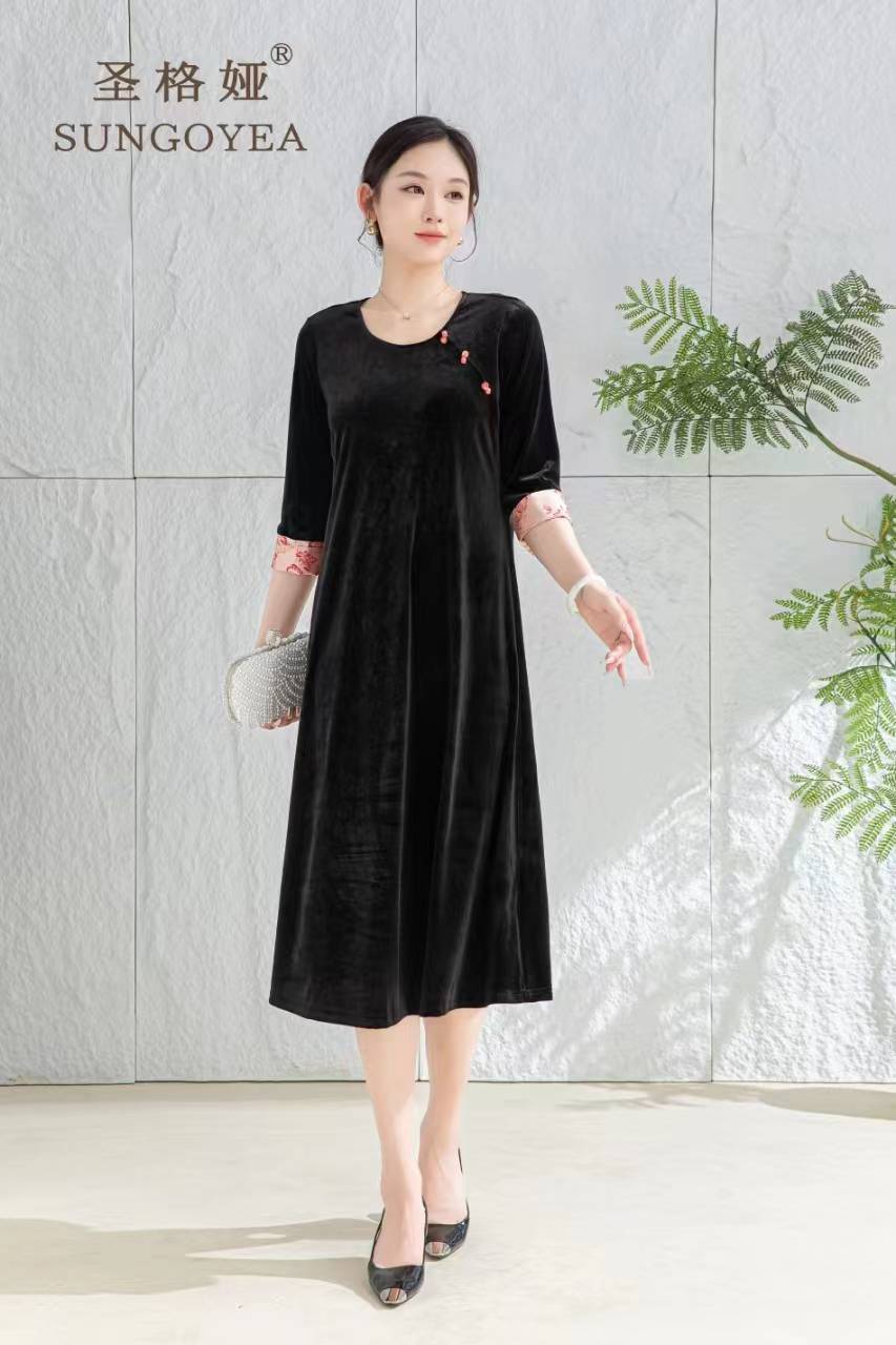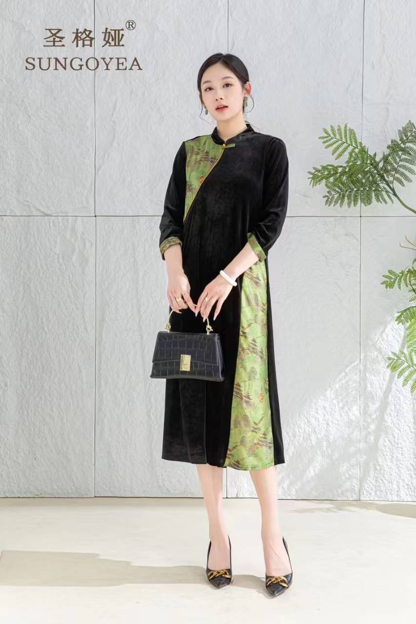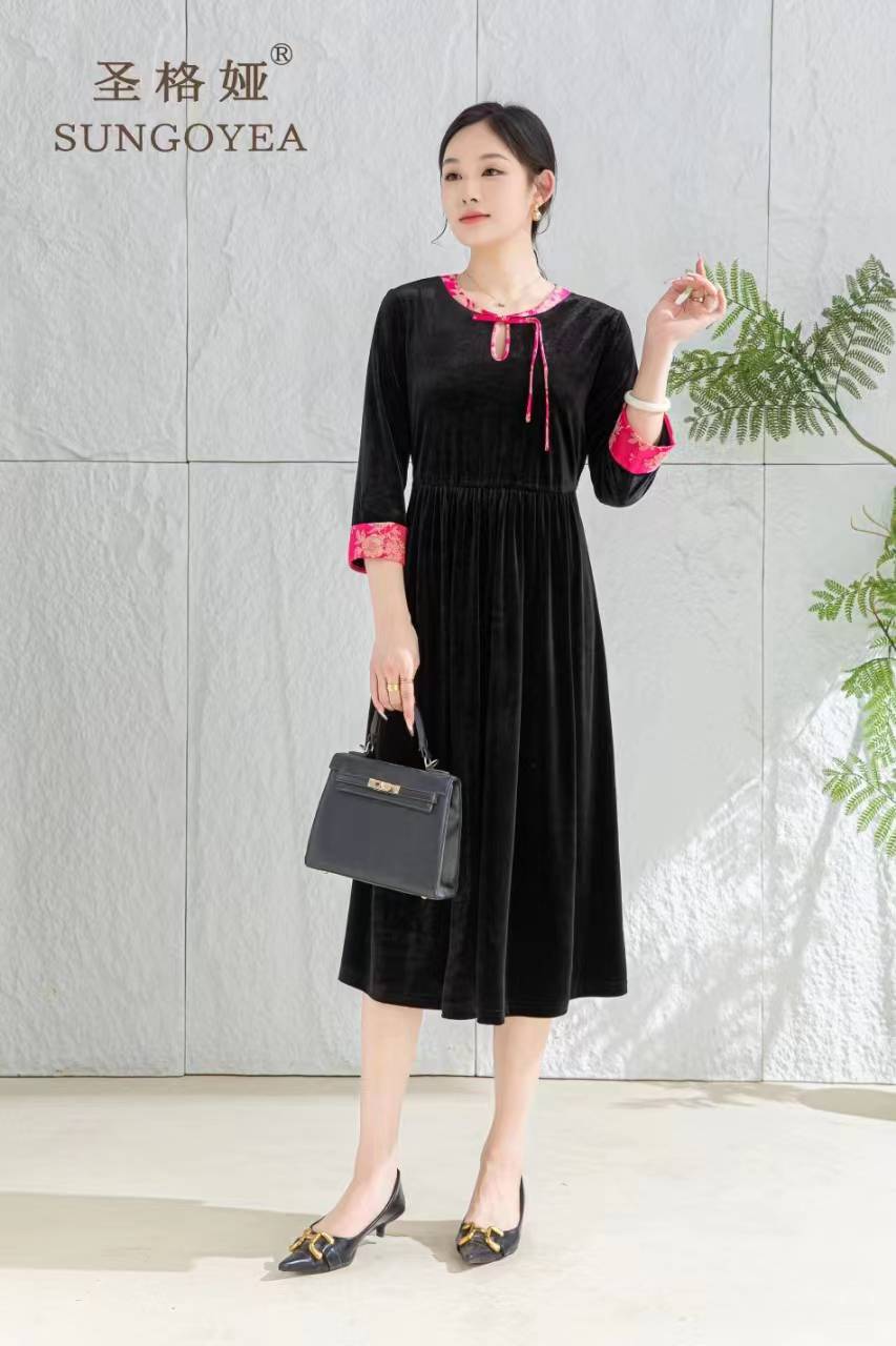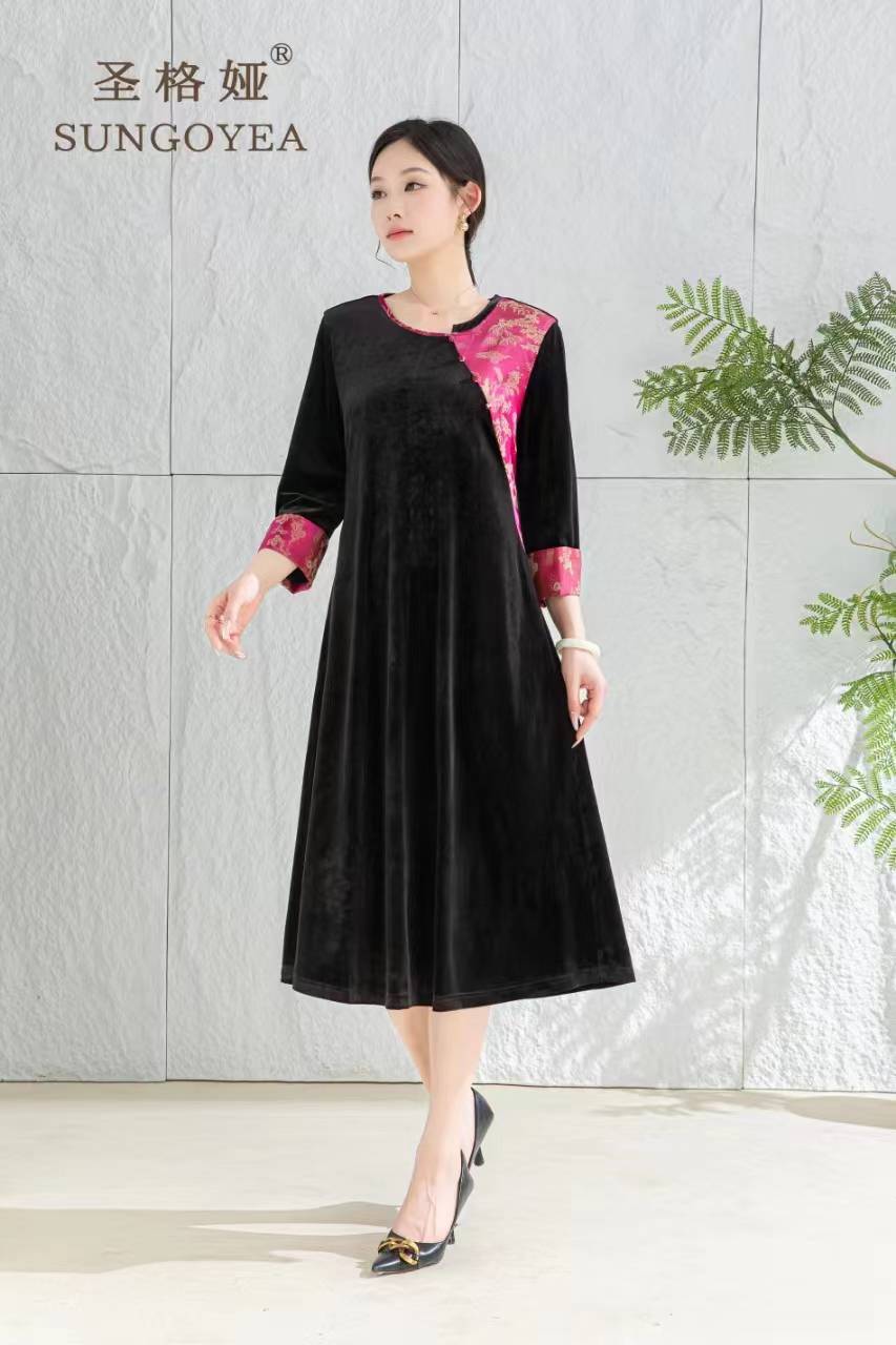 圣格娅秋冬丝绒连衣裙 国风复古优雅端庄连衣裙 气质大码拼接连衣裙