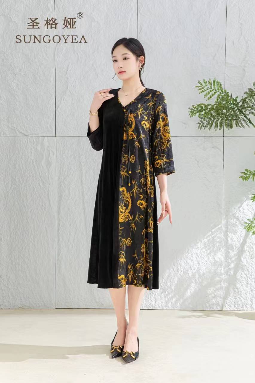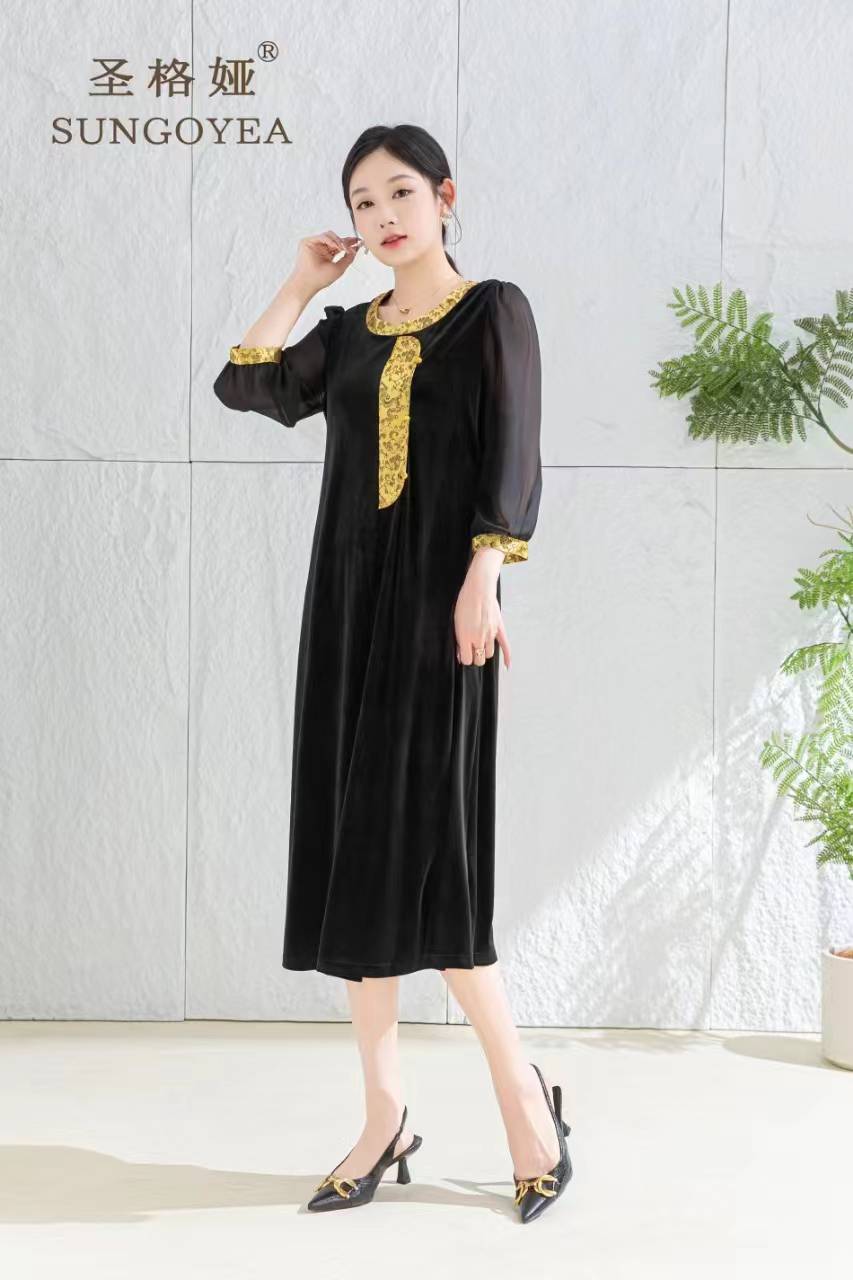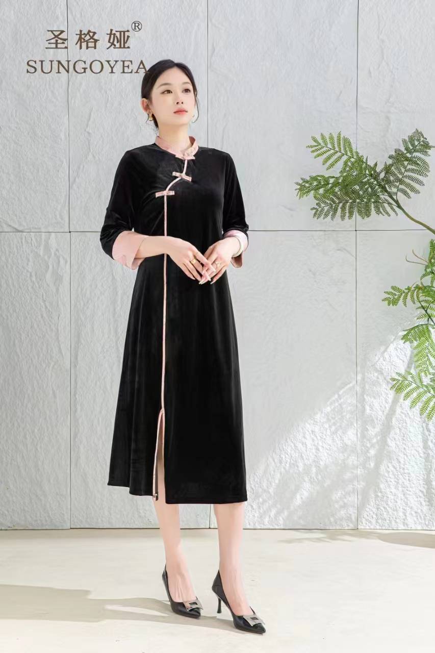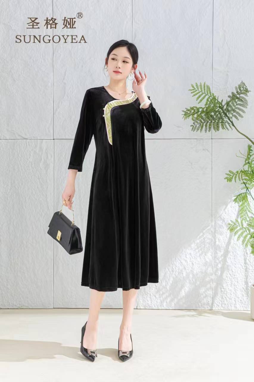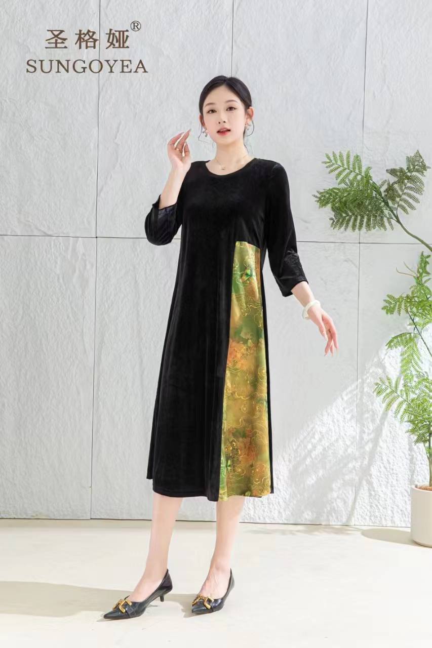 圣格娅秋冬丝绒连衣裙 国风复古优雅端庄连衣裙 气质大码拼接连衣裙
