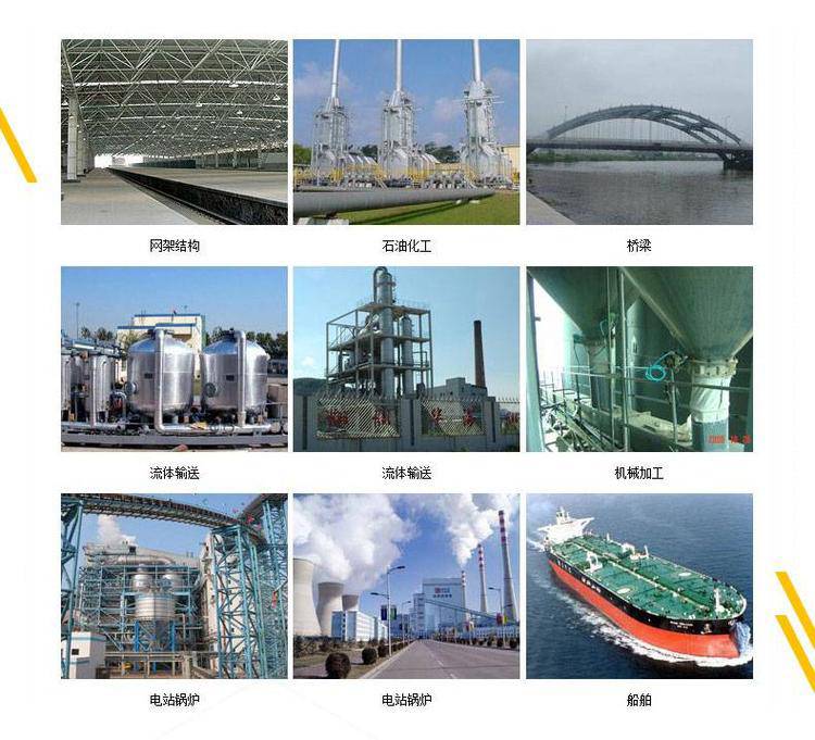 力工程,电厂,农业和化学机械,玻璃幕墙,汽车底盘,机场,锅炉建造,高速路栏杆,房屋建筑,压力