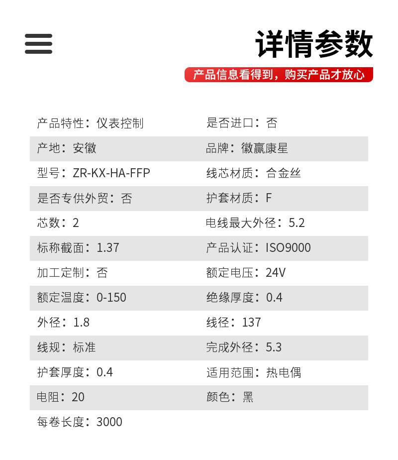 | 品牌:徽赢康星牌 | 型号:ZRC-KX-HA-F46P46FP | 线芯材质:合金丝 |