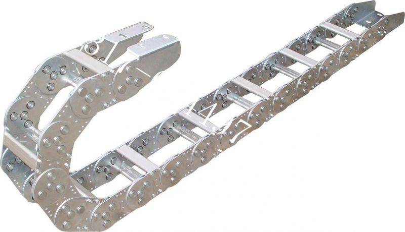 1.拖链可适应zui大移动速度40米/分。 2.拖链在zui大移动速度时,噪声声压级不大于68分贝。 3.拖链安全使用寿命不小于1 00万次(往复)。 钢制拖链规格 钢制拖链按结构可分为TL型钢制拖链和TLG型钢制拖链,钢制拖链按节距分类有45、65、75、95、100、125、180、225、250型。拖链宽度可按用户要求定做,弯曲半径从50-800之间。有三种支撑板的形式。(1)当拖链需承载较大管、缆负荷时、应选用高强度支撑板——整块式(2)当管缆的管接头尺寸大于支撑板内腔孔径或须经常拆装、维修等时。可选用支撑板——分开式(3)安装管缆的规格品种较多时,可选用支撑板——框架式。
