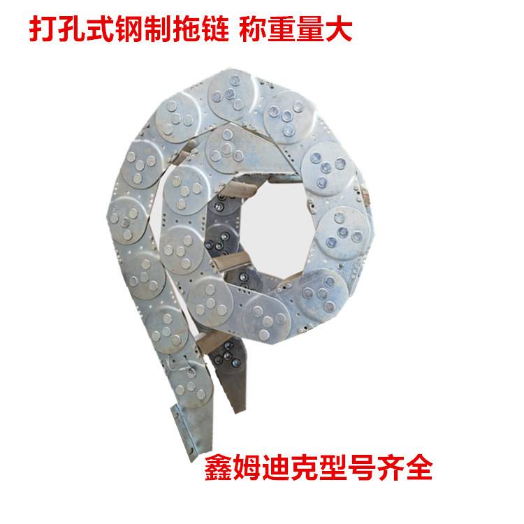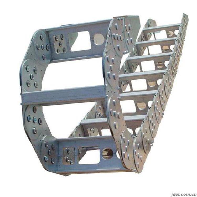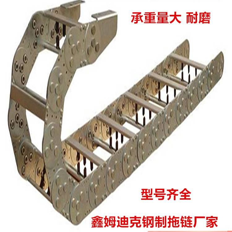 金属钢制坦克链 承重量大 车床TL125钢铝拖链 鑫姆迪克型号全钢制拖链按结构可分为TL型钢制拖链和TLG型钢制拖链,钢制拖链按节距分类有45、65、75、95、100、125、180、225、250型。拖链宽度可按用户要求定做,弯曲半径从50-800之间。有三种支撑板的形式。(1)当拖链需承载较大管、缆负荷时、应选用高强度支撑板——整块式(2)当管缆的管接头尺寸大于支撑板内腔孔径或须经常拆装、维修等时。可选用支撑板——分开式(3)安装管缆的规格品种较多时,可选用支撑板——框架式。