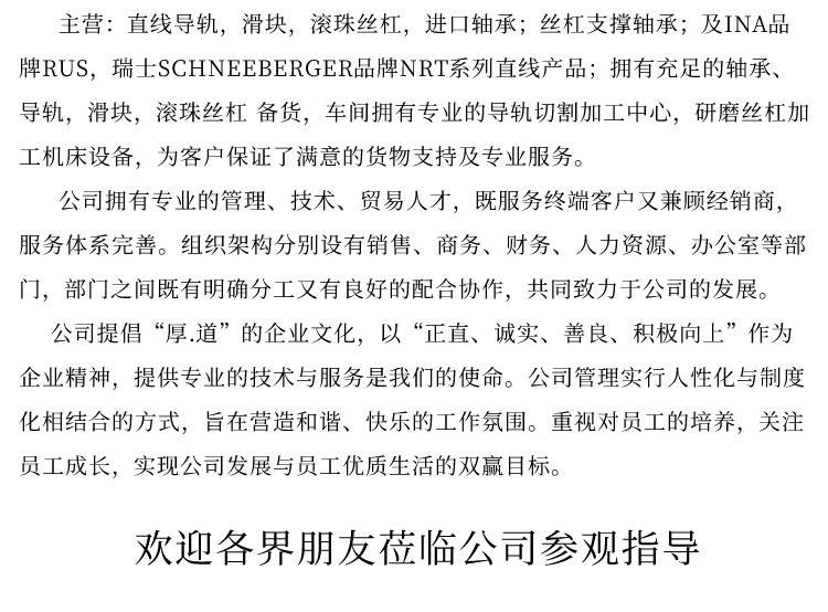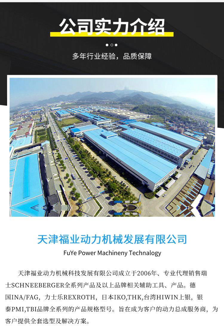我公司是瑞士施耐博格SCHNEEBERGER 授权天津的代理经销商。 一:瑞士施耐博格SCHNEEBERERG 1. [施耐博格]滚柱型线性滑块滑轨 规格(MR25-65系列) (环境恶劣可附带刮片ASM/ZCV) 2.[施耐博格]滚珠型线性滑块滑轨 规格(BM15-45系列) (环境恶劣可附带刮片ASM/ZCV) 3.无摩擦小滑台(NK/NKL/ND/NDN)系列 3. 4.交叉滚子式导轨(R/RN/NO/M/V系列) 5.滚柱循环式导轨(SK/SKD/SR系列) 6.平面式滚柱循环滑块 (NRT26111/NRT38144/NRT190