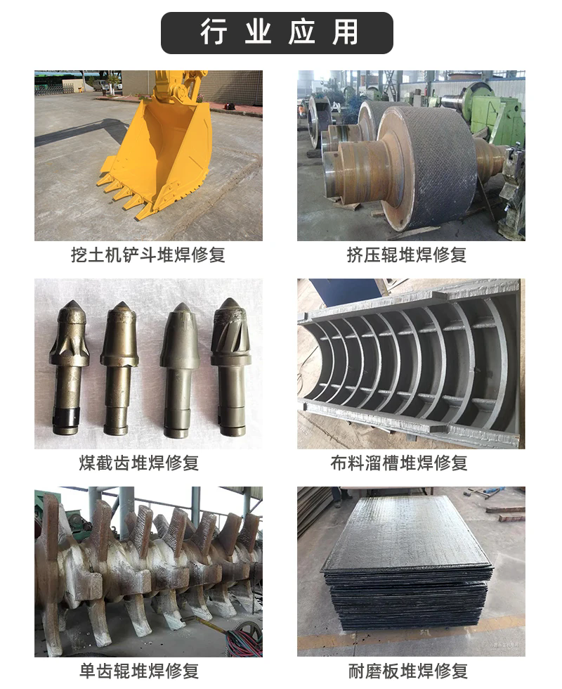 、电铲斗齿、钻头修补等的堆焊等。堆焊层硬度HRC大于72%。