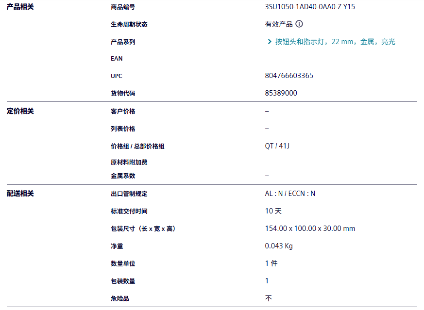 | 加工定制:否 | 品牌:Siemens/西门子 | 型号:3SU10501AD400AA0ZY15 |