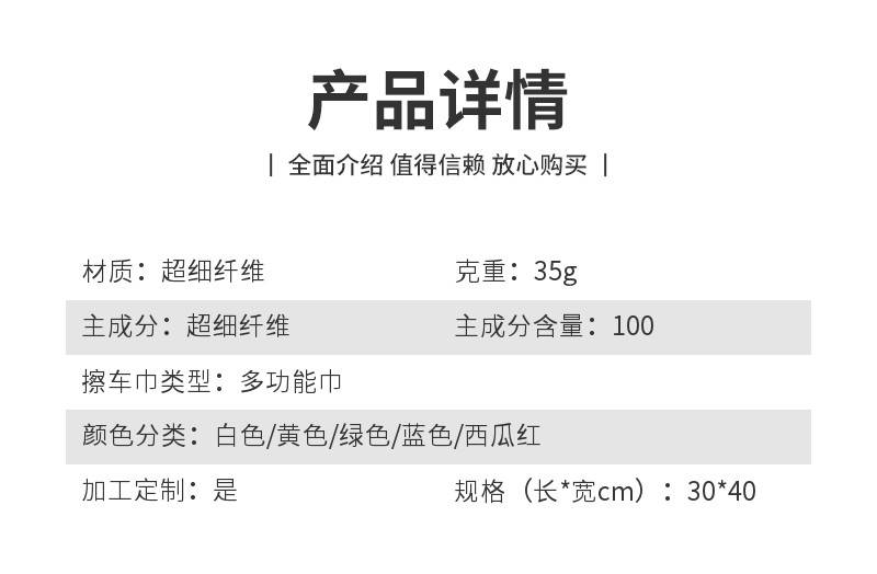 | 主成分含量:100 | 擦车巾类型:多功能巾 | 颜色分类:白色、 黄色、 绿色、 蓝色、 西瓜红 |