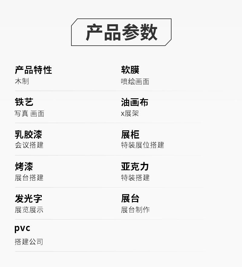 | 油画布:x展架 | 乳胶漆:会议搭建 | 展柜:特装展位搭建 |