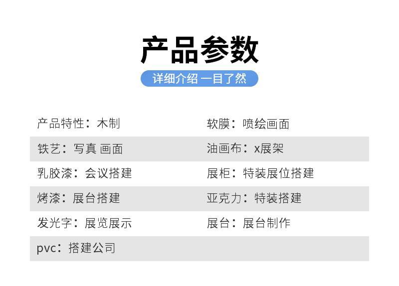 | 油画布:x展架 | 乳胶漆:会议搭建 | 展柜:特装展位搭建 |