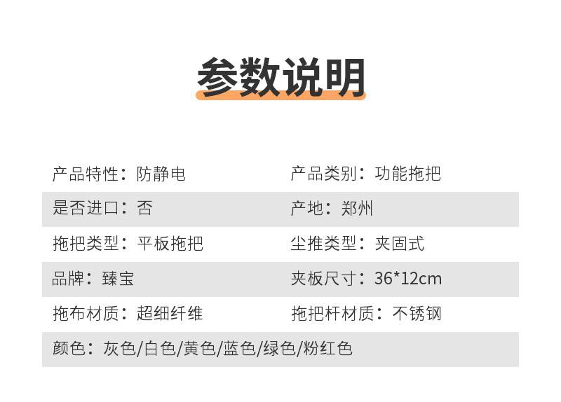 | 品牌:臻宝 | 夹板尺寸:36*12cm | 拖布材质:超细纤维 |