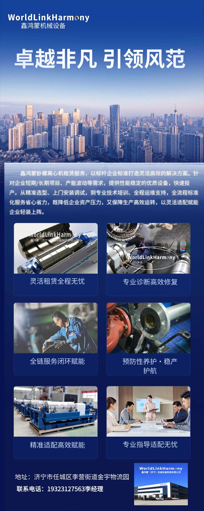 鑫鸿蒙(济宁)机械设备制造有限公司简介 匠心铸就分离之核,智慧赋能绿色未来 鑫鸿蒙(济宁)机械设备制造有限公司,屹立于孔孟之乡、运河之都,是一家深耕固液分离领域,集卧螺离心机研发、制造、销售、租赁、专业维保及配件供应于一体的高新技术企业。我们不仅提供***的产品,更致力于为全球客户提供全生命周期、高附加值的完整解决方案,驱动工业生产的清洁化、高效化与资源化进程。 技术为基,驱动分离革新 在工业环保要求日益严峻的今天,高效的分离技术是实现节能减排、循环经济的核心环节。鑫鸿蒙以技术创新为引擎,汇聚***研发团队,紧密追踪国际***技术动态。我们的产品涵盖多种型号的卧螺离心机,其核心部件经过精密计算与优化设计,在分离因数、处理能力、耐磨耐腐性能及自动化程度等方面均达到***水平。我们深知,稳定可靠的设备是客户生产的基石,因此,每一台出厂设备都历经千锤百炼的严格测试,确保在市政污水、化工、制药、食品、矿山等诸多严苛工况下,都能表现出色,为客户创造“泥水分离清晰,运行成本可控”的***价值。 服务为翼,成就客户价值 鑫鸿蒙的格局,超越了一般的设备供应商。我们深刻理解客户在投资效益、应急生产、设备维护中的多元需求与痛点。因此,我们构建了***弹性的“一站式”综合服务模式:从精准选型与高效能的设备销售,到灵活机动、盘活资金的设备租赁;从快速响应、防患于未然的维修保养,到品质过硬、供应及时的全系列配件支持,我们旨在成为客户身边最值得信赖的“分离技术管家”,确保客户生产系统的连续、稳定与高效,化降低全生命周期运营成本。 合作为舟,共赴浩瀚蓝海 面向未来,鑫鸿蒙将始终秉持“精益求精、客户至上、合作共赢”的核心价值观。我们期待与各界伙伴携手,以***的分离技术和真诚的专业服务,共同为解决环保难题、提升资源利用效率、助力产业升级贡献“鸿蒙智慧”与力量,为建设一个更加清洁、绿色的可持续发展未来而砥砺前行。