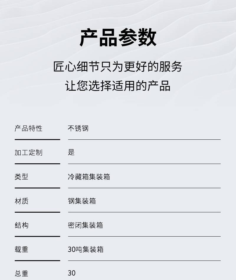 | 材质:钢集装箱 | 结构:密闭集装箱 | 载重:30吨集装箱 |