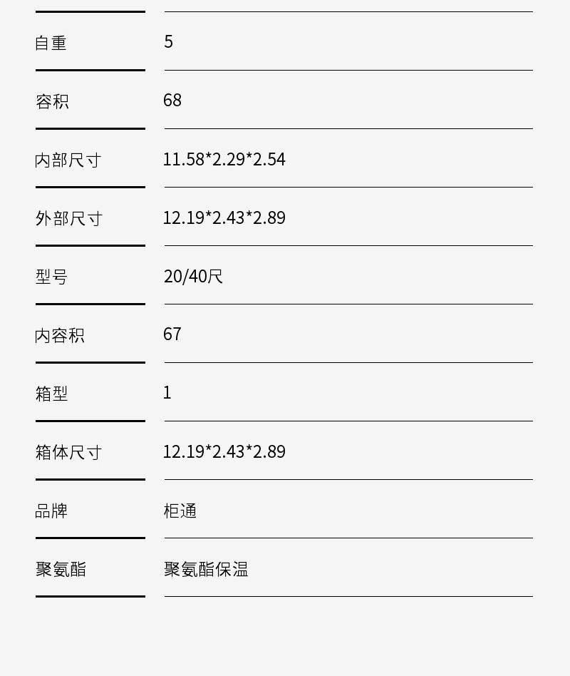 | 内容积:67 | 箱型:1 | 箱体尺寸:12.19*2.43*2.89 |