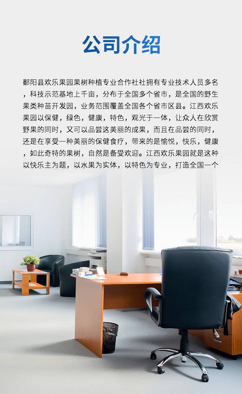 鄱阳县欢乐果园果树种植专业合作社社拥有专业技术人员多名,科技示范基地上千亩,分布于全国多个省市,是全国的野生果类种苗开发园,业务范围覆盖全国各个省市区县。江西欢乐果园以保健,绿色,健康,特色,观光于一体,让众人在欣赏野果的同时,又可以品尝这美丽的成果,而且在品尝的同时,还是在享受一种美丽的保健食疗,带来的是愉悦,快乐,健康,如此奇特的果树,自然是备受欢迎。江西欢乐果园就是这种以快乐主为题,以水果为实体,以特色为专业,打造全国一个与众不同的果树种植观光科技园。江西欢乐果园秉承“以科技为先导、靠服务求市场、以质量为生命、靠创新求发展”的企业宗旨。坚持“观乐果园,服务三农”的经营目标,以“观乐果园,创造快乐”的创新理念,从而达到丰富大家的生活,丰富人们的科普知识,最终达到带动地方百姓致富,从而带动地方经济,为现代化的经济贡献一份力量。 江西欢乐果园主要经营品种有:火参果,红参果,蓝参果,蓝蕉果,八月瓜,相思果,布福娜长寿果,神秘果,超级红树莓,九月黄金蕉,刺梨,无籽刺梨,无刺刺梨,红香果,大果桑,长果桑,红心猕猴桃,刺灯果,黑莓,洛神果,五眼果,拇指西瓜,黄秋葵,藜蒿,黑花生,降糖树,象牙菜,观音菜,救心菜,食用仙人掌,水芹菜,刺龙牙,新型皇竹草,甜象草,特色盆栽等。江西欢乐果园经营的品种全部是有药用兼食用的保健类佳果,我们传播种子及技术,其目的是推广优种,普及科技,是想让您通过小的投资博取大的收益。百姓富裕是我们的目标,每个人的健康快乐的生活是我们永远的奋斗宗旨。今天我们江西欢乐果园就是要带给你这样的健康产品,带给你不一样的全新感受,请赶快加入这个健康团队中来吧,让我们一起携手打造一个健康乐园。