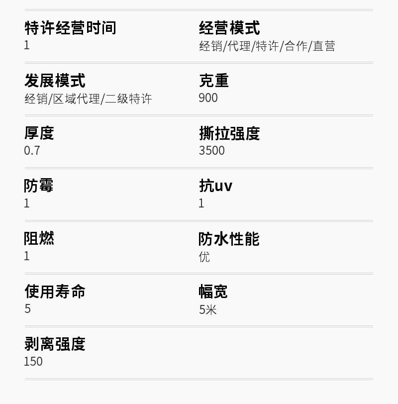 | 克重:900 | 厚度:0.7 | 撕拉强度:3500 |