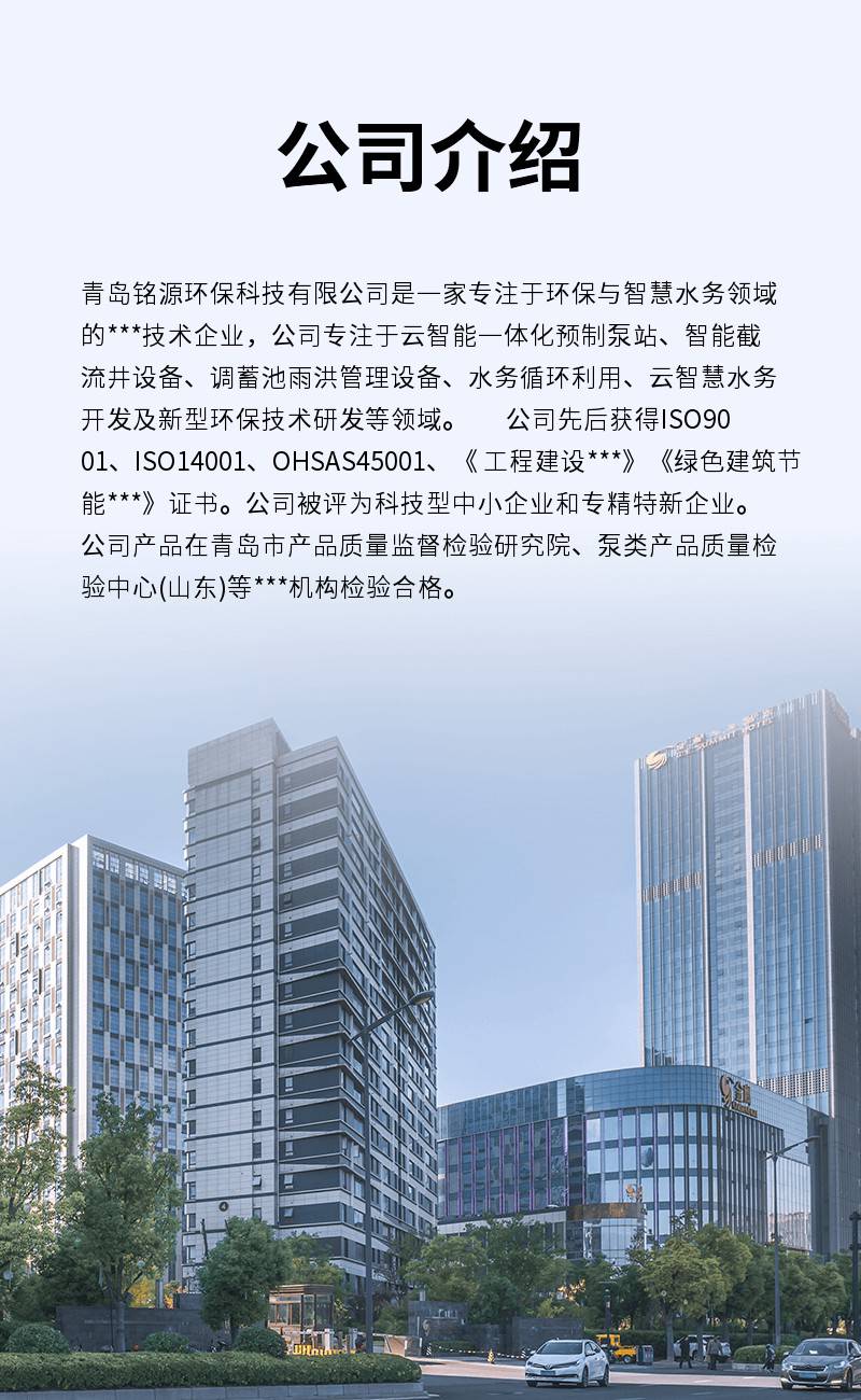 青岛铭源环保科技有限公司是一家专注于环保与智慧水务领域的***技术企业,公司专注于云智能一体化预制泵站、智能截流井设备、调蓄池雨洪管理设备、水务循环利用、云智慧水务开发及新型环保技术研发等领域。 公司先后获得***、***14001、OHSAS45001、《 工程建设***》《绿色建筑节能***》证书。公司被评为科技型中小企业和专精特新企业。公司产品在青岛市产品质量监督检验研究院、国家泵类产品质量检验中 心(山东)等国家***机构检验合格。且取得三十多项国家实用新型***和计算机软件著作权登记证书。 铭源环保下辖平度分公司和潍坊分公司,铭源睿信一个子公司。铭源睿信以水务自动化、智慧水务和新型环保技术研发为主;平度分公司以智能截流设备、调蓄池雨洪管理设备研发制造为主,潍坊分公司以一体化泵站、小型分散式污水处理设备制造为主。采取多点布局、优势互补的原则,为客户提供优质的产品和服务。 铭源环保在给排水、污水处理领域深耕细作,秉承以为客户提供优质产品、专业技术服务的服务宗旨。为客户提供量身定制方案,提供多种配置方案满足实际使用需求。严控供货周期,并提供高标准售后服务。 以环保为己任,视质量如生命,以技术做先导,靠诚信赢客户。