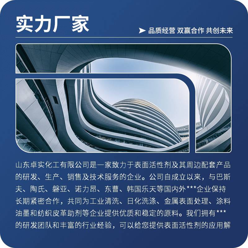山东卓实化工有限公司是一家致力于表面活性剂及其周边配套产品的研发、生产、销售及技术服务的企业。公司自成立以来,与巴斯夫、陶氏、磐亚、诺力昂、东曹、韩国乐天等国内外***企业保持长期紧密合作,共同为工业清洗、日化洗涤、金属表面处理、涂料油墨和纺织皮革助剂等企业提供优质和稳定的原料。我们拥有***的研发团队和丰富的行业经验,可以给您提供表面活性剂的应用解决方案,更专业的技术咨询,及时的市场分析和完备的售后服务。 山东卓实化工秉持"***品质,实诚立业"这一原则,追求产品性能的***,更坚守对客户、对社会的诚信承诺。作为值得信赖的合作伙伴,卓实化工始终以稳定可靠的供应和专业的服务,助力客户价值提升,共筑可持续发展的产业生态。努力做到让客户精简工艺,节约成本,提升产品性能,携手客户共同发展,合作共赢!